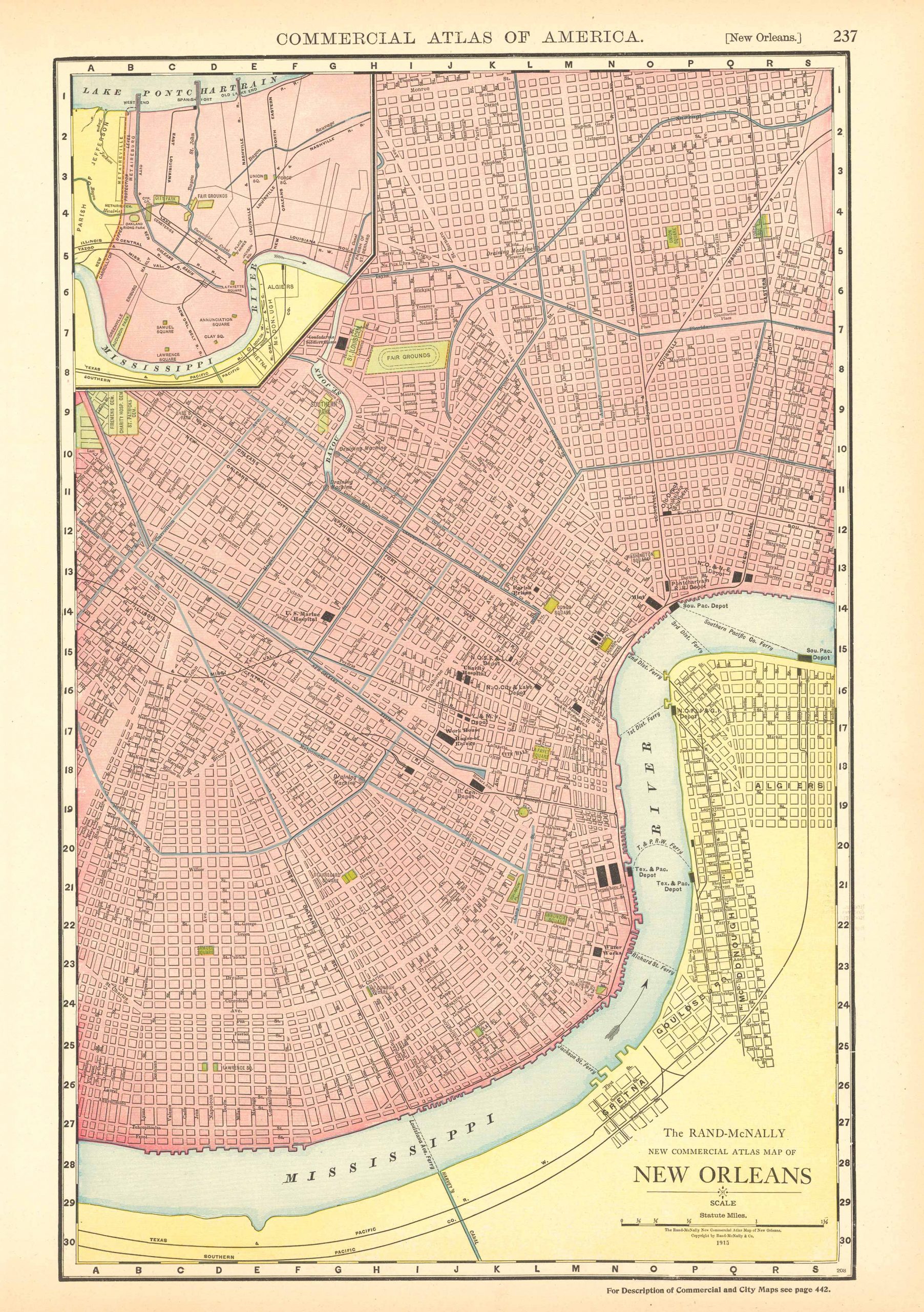 This map of New Orleans was produced by Rand McNally and Co. as part of its Commercial Atlas of America. These maps are some of our favorite maps because of the large size of each map. The detail shown on each map is exceptional because of the map size. These maps were intended to be used by business for shipping and other uses. Roads, railroads, rivers, and buildings are clearly shown. There is more detail on these maps than any others during this time period.