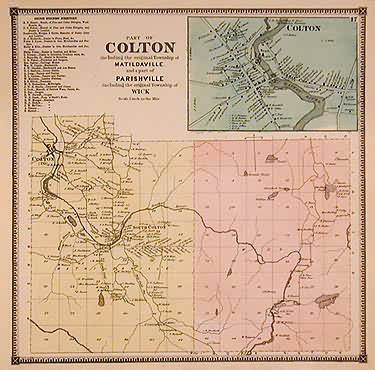 The “New Topographical Atlas of St. Lawrence County, New York” was made from the surveys of D. G. Beers, and published by Stone & Stewart in 1865. Each hand colored map illustrating a town in St. Lawrence includes abundant, historically significant details. The name of the town, streets, railroad lines, important buildings, the locations of property and the names of landowners, parks, rivers, and more relevant features are identified. This map shows part of Colton including Matildaville, Parishville and Wick with an inset og the center of Colton and a list of local businesses.