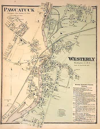 This map is from the Atlas of the State of Rhode Island and Providence Plantations from Actual Surveys and Official Records compiled and published by D.G.Beers and Co. in 1870. Westerly in Washington County and Pawatuck in Stonington, New London are illustrated on this map. A list of local businesses in Westerly is provided, including the names, service or product and general location of the business. Details include town names, street plans, lakes, rivers, parks, important buildings, the names and locations of major land owners and businesses, and railroads. This beautiful hand colored pastel map would make a great gift for a resident of the area interested in local history.