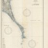This coastal survey was printed by the U.S. Navy Hydrographic Office in Washington D.C. Details include the names of cities and waterways along the coast. Depth soundings are shown in fathoms. Other details that maybe included are lighthouses and buoy positions.