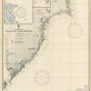 This coastal survey was printed by the U.S. Navy Hydrographic Office in Washington D.C. Details include the names of cities and waterways along the coast. Depth soundings are shown in fathoms. Other details that maybe included are lighthouses and buoy positions.