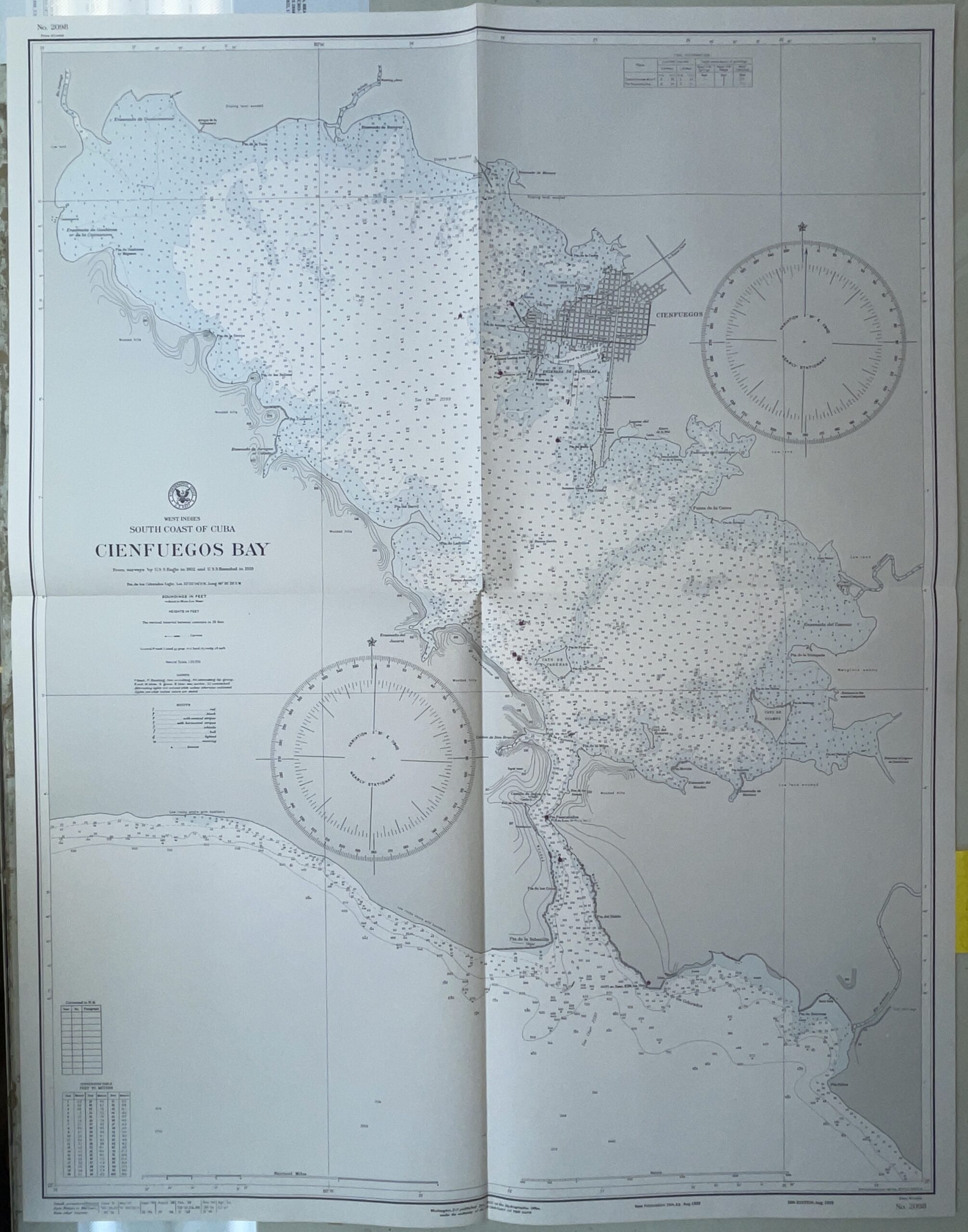 South coast of Cuba. This coastal survey was printed in March 1943 by the U.S. Navy Hydrographic Office in Washington D.C. Details include the names of cities and waterways along the coast. Depth soundings are shown in fathoms.