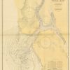 This coastal survey was printed by the U.S. Navy Hydrographic Office in Washington D.C. Details include the names of cities and waterways along the coast. Depth soundings are shown in fathoms. Other details that maybe included are lighthouses and buoy positions.