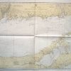 This coastal survey was made in Washington D.C. on December 22, 1944 by the U.S.Coast and Geodetic Survey department. The Long Island Sound and the surrounding coasts of Connecticut and New York are illustrated on this map. Details include the names of creeks and rivers, depth readings, bridges, important buildings along the coast,railroads, cable areas, restricted areas, and the names of some cities. Most recent corrections,zoning grids, buoys, beacons, and lights are hand stamped on the map Notes on the map read: Warning: Aids to navigation may be altered, interrupted or removed without notice. In general, temporary changes due to war conditions are not incorporated on the chart. Caution Improved Channels- The side limits of the improvement are shown by broken lines. The controlling depth through the channel, on the date given, is placed in or alongside the channel, or in a seperate note, but no depth greater than the project depth is given. Because of possible shoaling, particularly at the edges, it must not be inferred that the depth stated exsisted throughout the entire width of the improvement on the date of the examination unless so stated, or that it has not since decreased in places across the entire width.