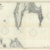 This coastal survey was printed by the U.S. Navy Hydrographic Office in Washington D.C. Details include the names of cities and waterways along the coast. Depth soundings are shown in fathoms. Other details that maybe included are lighthouses and buoy positions.
