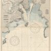 This coastal survey was printed by the U.S. Navy Hydrographic Office in Washington D.C. Details include the names of cities and waterways along the coast. Depth soundings are shown in fathoms. Other details that maybe included are lighthouses and buoy positions.