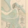 This coastal survey was printed by the U.S. Navy Hydrographic Office in Washington D.C. Details include the names of cities and waterways along the coast. Depth soundings are shown in fathoms. Other details that maybe included are lighthouses and buoy positions.