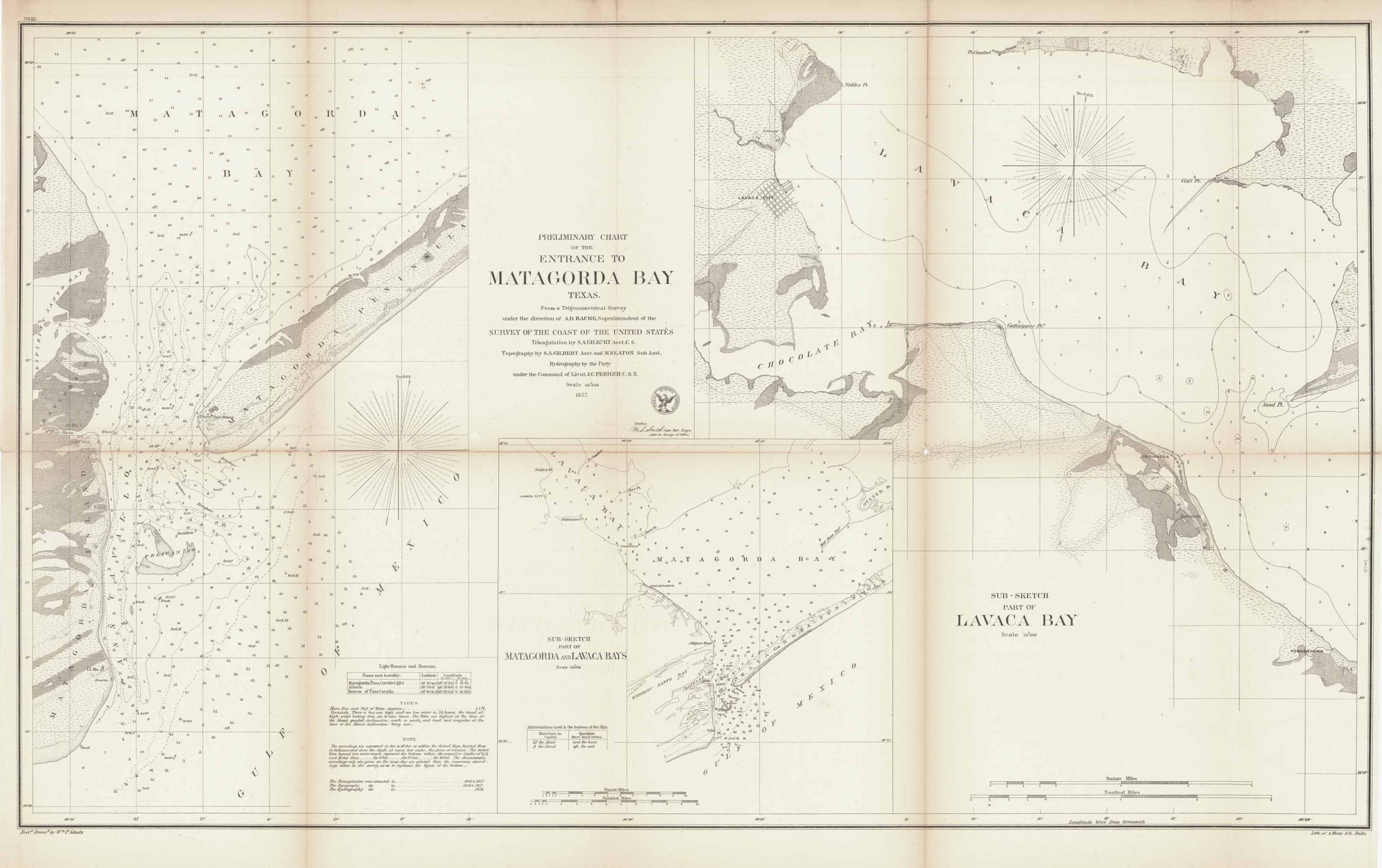 This black and white, antique coastal survey was made by the United States Navy’s Hydrographic Party. The surveys provide sailing instructions and notes on important characteristics of the area mapped. Depth readings, descriptions of bottom materials, light houses and important cities along the coast are identified on the survey. These charts show areas that have likely undergone significant changes due to modifications and recessions of coastal lands, making them fascinating to anyone interested in local geography and history. This coastal survey, produced in 1857, shows the entrance to Matagorda Bay and a sub-sketch of Lavaca Bay. Islands in the bay and lighthouses. Notes include remarks on the tides and on the accuracy of the soundings.