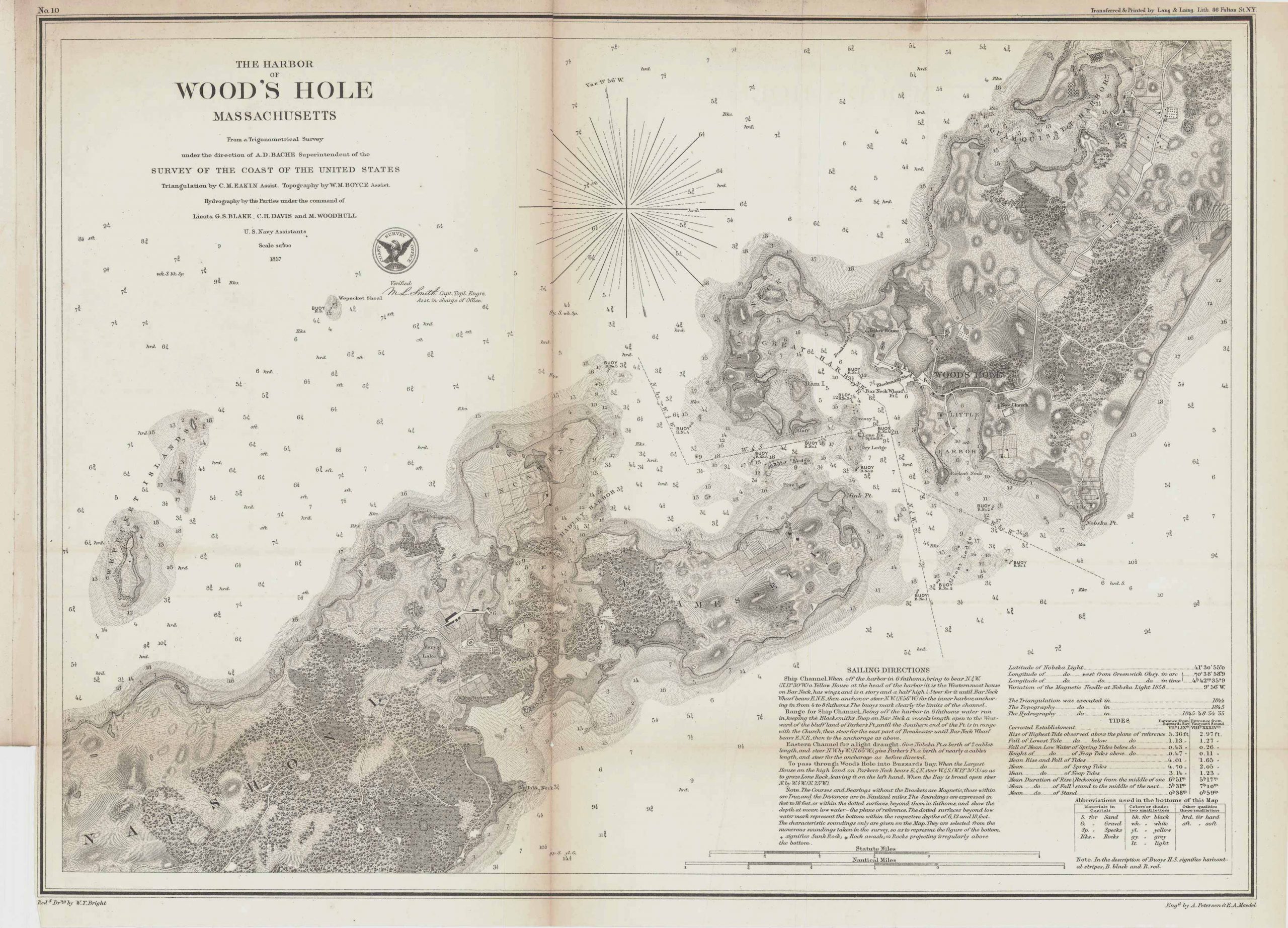 This 1857 nautical chart of Woods Hole in Massachusetts provides information on bottoms, soundings, tides, and also contains sailing directions for the area. The chart extends as far south as Naushon Island, as far north as Quamquisset Harbor, as far west as Wepecket Island, and as far east as Wood’s Hole. Some topographic detail is shown; the map also shows lakes, harbors, a church, a yellow house, a blacksmith shop, and more. Nobska Lighthouse, although not labeled this name on the map, is shown beneath present-day Falmouth Heights near what was called Nobska Point. Currently, Nobska Point sits near Uncatena Island. Present-day Ram Island, Grassy Island, Pine Island and Little Harbor are labeled. What’s called Bluff Island is now Devil’s Foot Island. While Uncatena Island is identified, Bull Island, Goat’s Neck, Monohansett Island, and Cedar Island are not.