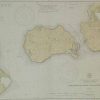 This coasal survey was completed in May 1944 by the U.S Coast and Geodetic Survey/ Robinsons Hole and Quicks Hole is represented. Topographical features are illustrated on the island. Tidal informaton, lights, bouys and Coast Guard Stations are noted. Notes stamped on the map read: ” Warning: Aids to Navigation may be altered, interrupted or removed without notice. In general, temporary changes due to war conditions are not incorporated on the chart”.