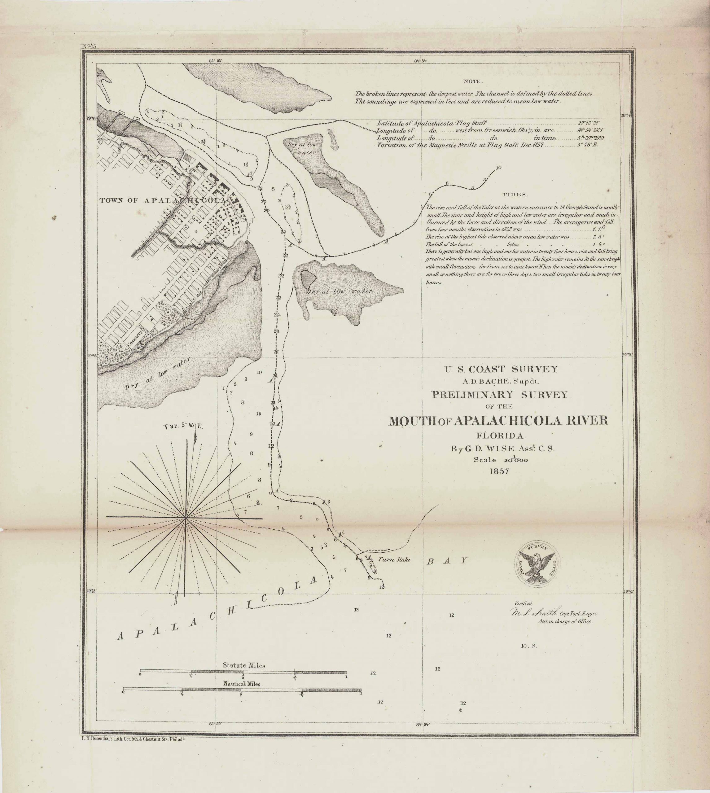 This black and white, antique coastal survey was made for the United States Coast Survey. The surveys provide depth readings and notes on important coastal characteristics of the area mapped. The names of harbors, rivers, islands, channels, shoals, capes, inlets, and coastal towns are identified on the map. These charts show areas that have likely undergone significant changes due to modifications and recessions of coastal lands, making them fascinating to anyone interested in local geography and history. This map details Apalachicola River and the town of Apalachicola.