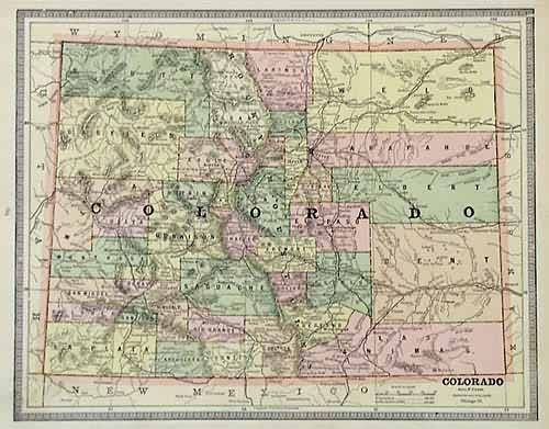 George F. Cram produced this map for Crams Unrivaled Family Atlas of the World, published in 1885. This single page map of Colorado illustrates counties, cities, towns, rail roads and topographical features. Great detailing, with nice pastel coloring.