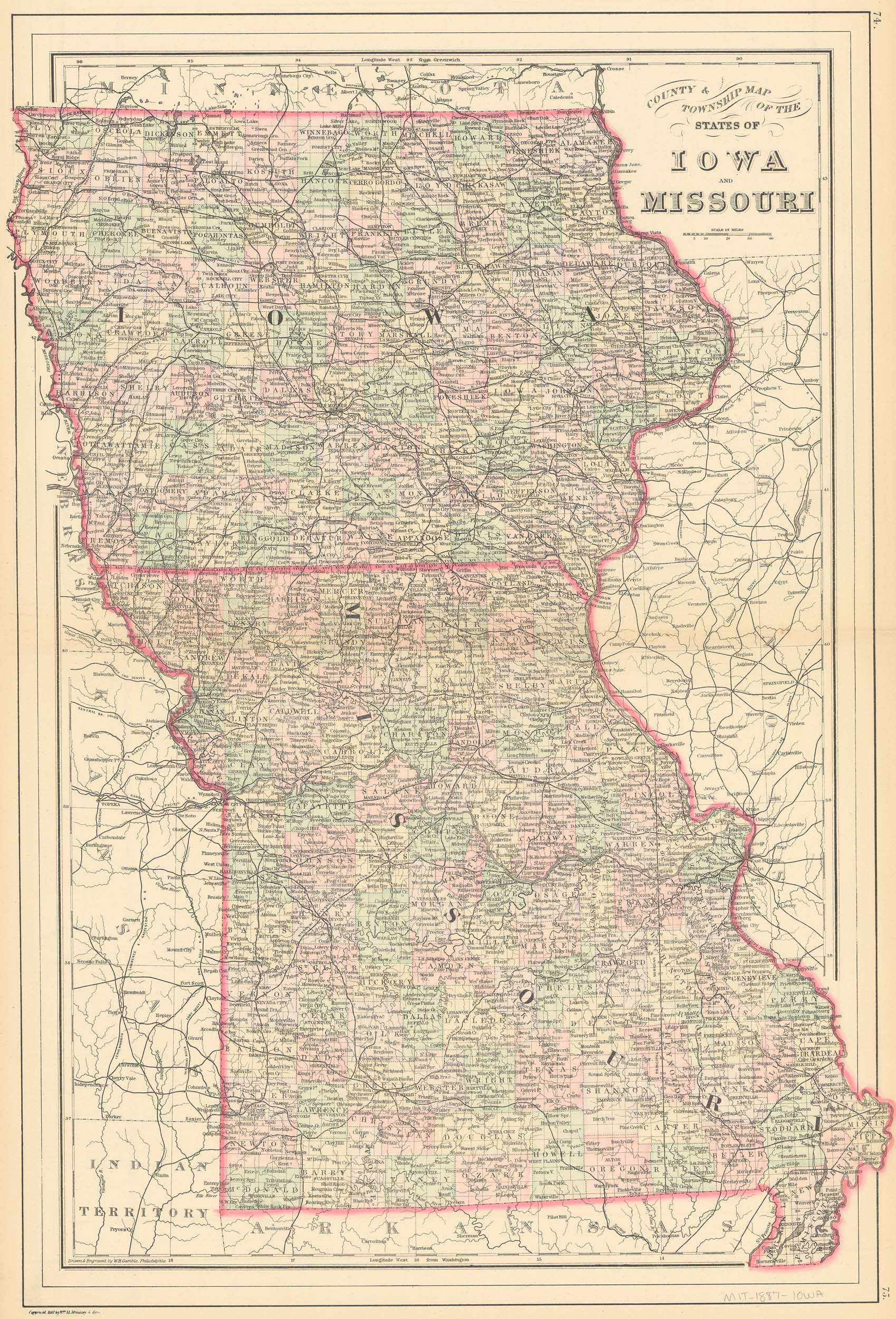 This map was made by S. Augustus Mitchell for Mitchells New General Atlas, published in 1887. The well maintained maps in this atlas feature Mitchell’s characteristic pastel coloring and abundant details of geographical features. Iowa and Missouri are illustrated on this double page map. Details include the names of counties, important towns, rivers, lakes, and railroads. Counties are distinguished by color. These 1887 maps offer a fascinating perspective of areas that have since undergone significant growth and change, in addition to their value as great examples of Mitchell’s work. This map has water stains in the margin that do not affect the map.
