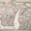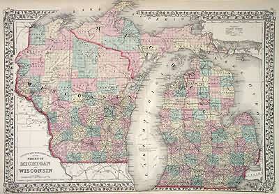 This hand colored map was made for “Mitchells New General Atlas” published in 1877 by S. Augustus Mitchell. Michigan and Wisconsin are illustrated on this map. Counties are highlighted by different colors. Other details include the names of counties and important cities, major roads, lakes,mountains, and rivers.