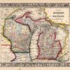 This beautiful map of Michigan and Wisconsin was made by S. Augustus Mitchell, in 1860, for his New General Atlas. This map features bright original hand coloring that differentiates regions and county sections, a decorative floral border, and fine detailing (including railroads, rivers, lakes, cities, towns, and roads).