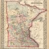 The Mitchell company was one of the first to try out the new technique of engraving on steel plates, experimenting with steel almost 20 years before the rest of the publishing industry. He was printing with steel in the early 1830s; the general switch to steel was approximately 1850. During the early years of the company, Mitchell published mainly maps and travel guides. In 1860, Mitchell started producing “Mitchell’s New General Atlas”, and Mitchell Sr. retired and turned the business over to his son of the same name. The New General Atlas was published until 1893. Today Mitchell maps are sought after for their fine engraving, bright coloring, and attention to detail. They are some of the finest maps produced in the 1860’s. This map produced in 1867, has Mitchell’s unique floral border, and beautiful hand coloring. This map details Minnesota. Counties, cities, towns, transportation routes, and topographical features are illustrated.