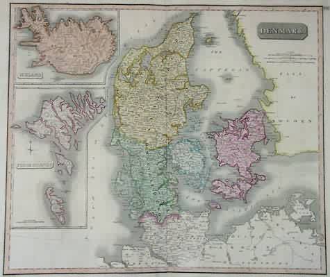 This hand colored map of Denmark was made for Thomsons “New General Atlas” in 1814. Regions are distinguished by remarkably well-maintained outline, in pastel colors. Details include the names of important cities, mountains, rivers, and lakes. Insets of Iceland and the Feroe Islands are located in the left portion of the map. This map is in excellent condition.