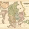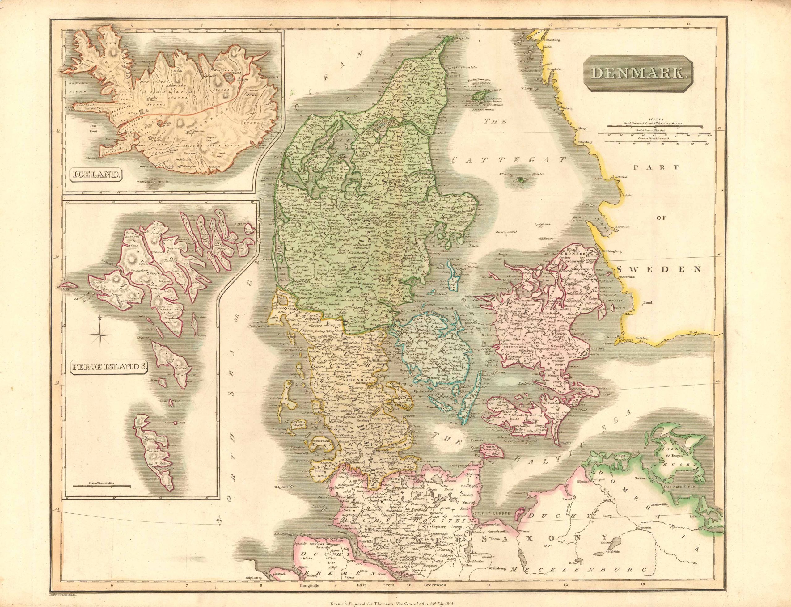 This hand colored map of Denmark was made for Thomsons “New General Atlas” in 1815. Regions are distinguished by remarkably well-maintained pastel color. Details include cities, rivers, important regions, and topography. This double-paged map is a fine example of Thomson’s work.