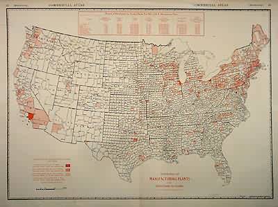 The 1936, sixty-seventh edition of the “Rand McNally Commercial Atlas and Marketing Guide” is unique in its inclusion of informative details concerning population sizes, district uses, the size of counties, and railroad routes. The distribution of manufacturing plants in the United States is illustrated by shading on this large double page map. A chart above the map comparison of the seven counties that had the first 25% of U.S. manufacturing plants.