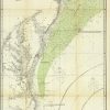 This coastal survey chart was published in 1870 from U.S. Coast Surveys and most recent authorities. Soundings are listed in fathoms, heights in feet. A small chart at the top indicates the high water (full and change), the mean rise and fall of Spring tides for the main points, hooks, capes, and harbors. This chart focuses on mackerel fish where the colored portions of the chart show the waters frequented by mackerel in their migrations from first being seen in March and followed north by fishermen. This chart covers the east coast from Cape Lookout in North Carolina up to the Long Island Sound.