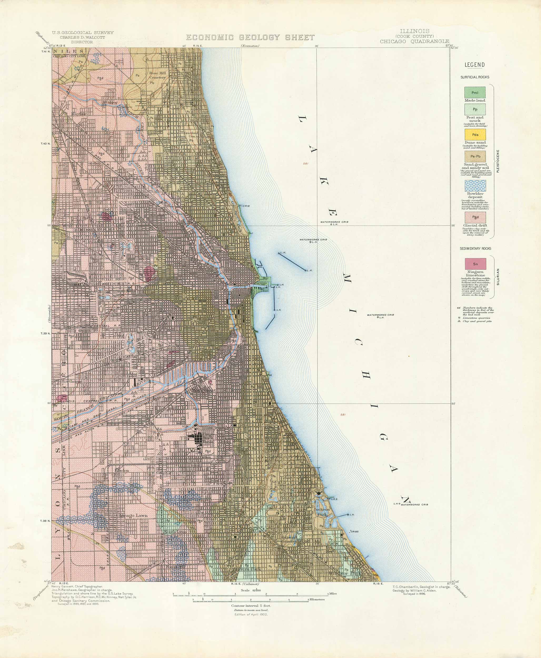 Highly detailed US Geologic Survey Economic Geology map of Cook County, Chicago Quadrangle.