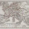 E. V. Monin made this 1822 edition of the “Atlas Universel de Geographie Ancienne & Moderne en 42 Cartes” in Paris. Bright colors highlight regions on these small, but detailed maps. This hand colored, French map illustrates the empire of Charlemagne. The names of regions, important cities, mountain ranges, lakes and rivers are identified. These old maps are in very good condition with unique outline coloring.