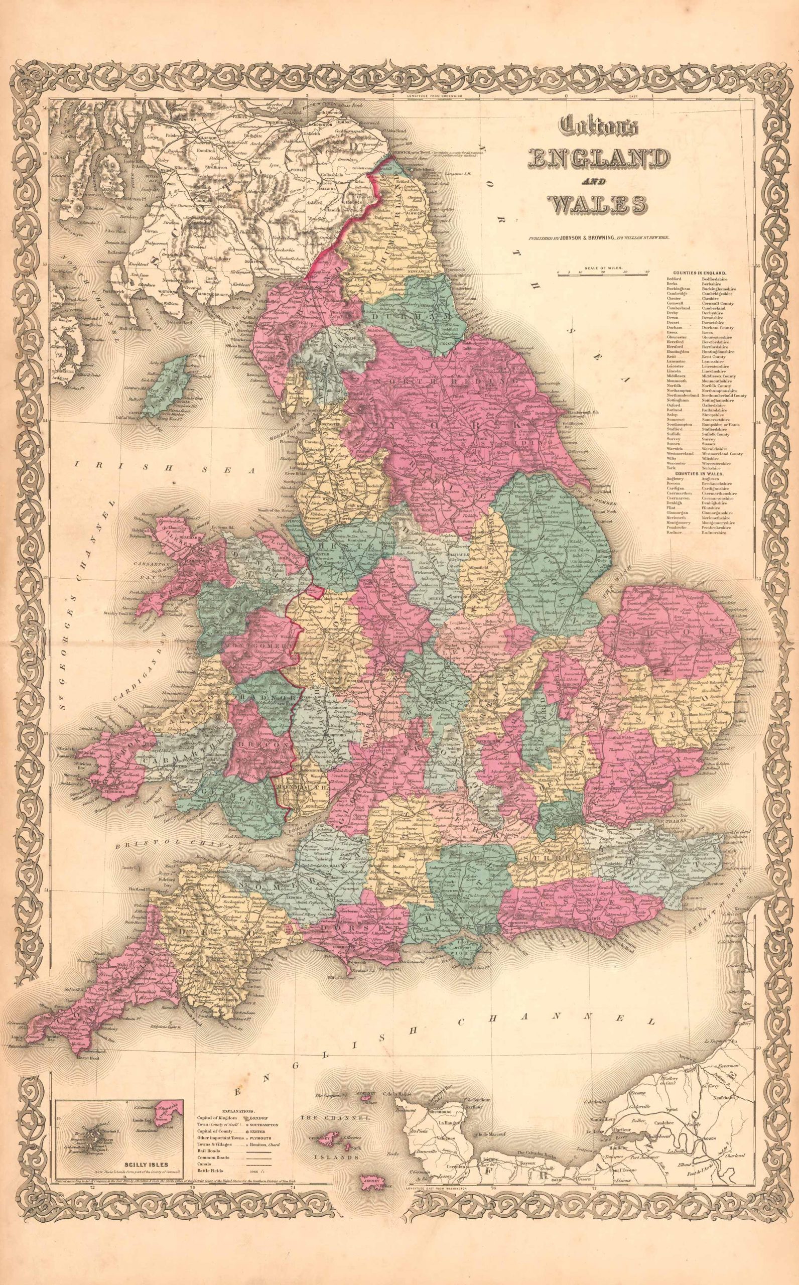 Art Source International is proud to offer this map from the 1860 edition of Coltons General Atlas. Colton atlases, especially those from the late 1850’s, have become increasingly rare. The General Atlas was the first single edition atlas published by the Colton brothers succeeding the expensive two volume Atlas of the World. These maps have the signature ‘ inch Colton border surrounding each map. The Colton firm refused to compromise quality, choosing to compete for sales in the finer quality international market rather than the cheap domestic one. Because of this, all maps were engraved by steel plates rather than by wax engraving which was the most common method used at this time. This map of England is very detailed with identification of counties, cities, townships, railroads, battle fields, common roads, canals, creeks and rivers. In the inset, the map shows the Scilly Isles. Each map has beautiful muted red, green, tan, pink, and yellow hand coloring.