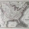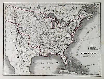 E. V. Monin made the “Atlas Universel de Geographie Ancienne & Moderne en 42 Cartes” circa 1822 in Paris. Bright colors highlight regions on these small, but detailed maps. This hand colored, French map illustrates the United States. Much of the country is named according to the Native American tribe occupying the region. The names of regions, important cities, mountain ranges, lakes and rivers are identified. These old maps are in very good condition with unique outline coloring.