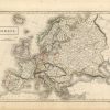 This hand colored map was made by Adam and Charles Black for “Blacks General Atlas” published in 1841. Europe is illustrated on this map. Details include the names of countries and many cities, and illustrations of rivers, railroads, lakes, and mountains. Regions are distinguished by pink, yellow, blue, and green outline color which is well maintained for the age of the map. The impression of the press used to engrave the map is still visible.