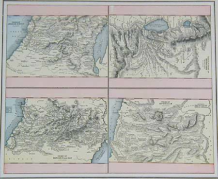 This detailed map was produced for Crams 1895 “Universal Atlas – Geographical, Astronomical and Historical.” In 1869, the George F. Cram Company was born, and the Cram name quickly became synonymous with accuracy and innovation. This map depicts four views of biblical holy land tribes, Tribes of Judah and Simeon, Manasseh, Ephraim and Benjamin and Dan.