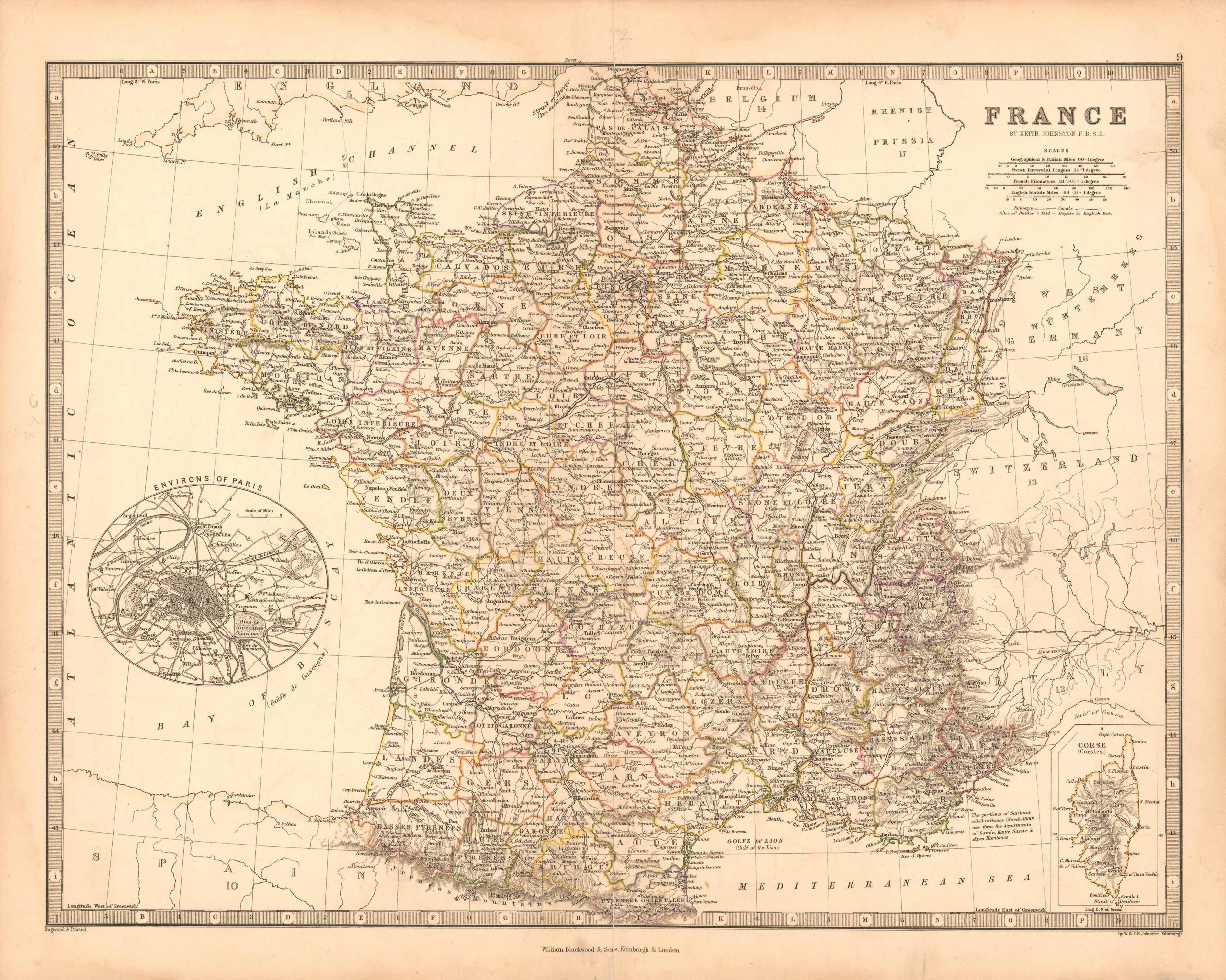Alexander Keith Johnston, took the title Geographer at Edinburgh to the Queen when he began map-making in Scotland in 1826. Johnston, famous for his attention to geographic detail, made this rare edition of the “Handy Royal Atlas of Modern Geography” in 1868. France is illustrated on this hand colored map. Details include inset maps of the environs of Paris and Corsica, the names of regions, rivers, lakes, mountains, important cities and state borders. Each large scale map was printed on thick paper with vibrant color highlighting borders.
