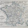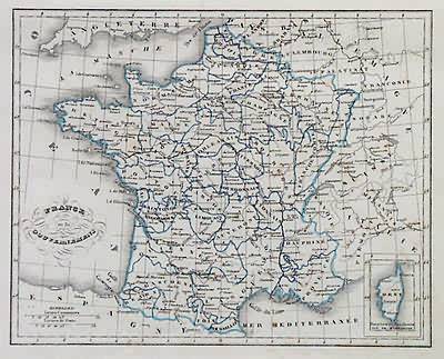 E. V. Monin made the “Atlas Universel de Geographie Ancienne & Moderne en 42 Cartes” circa 1822 in Paris. Bright colors highlight regions on these small, but detailed maps. This hand colored, French map illustrates France with an inset of Corsica as politically divided in 1932. The names of regions, important cities, mountain ranges, lakes and rivers are identified. These old maps are in very good condition with unique outline coloring.