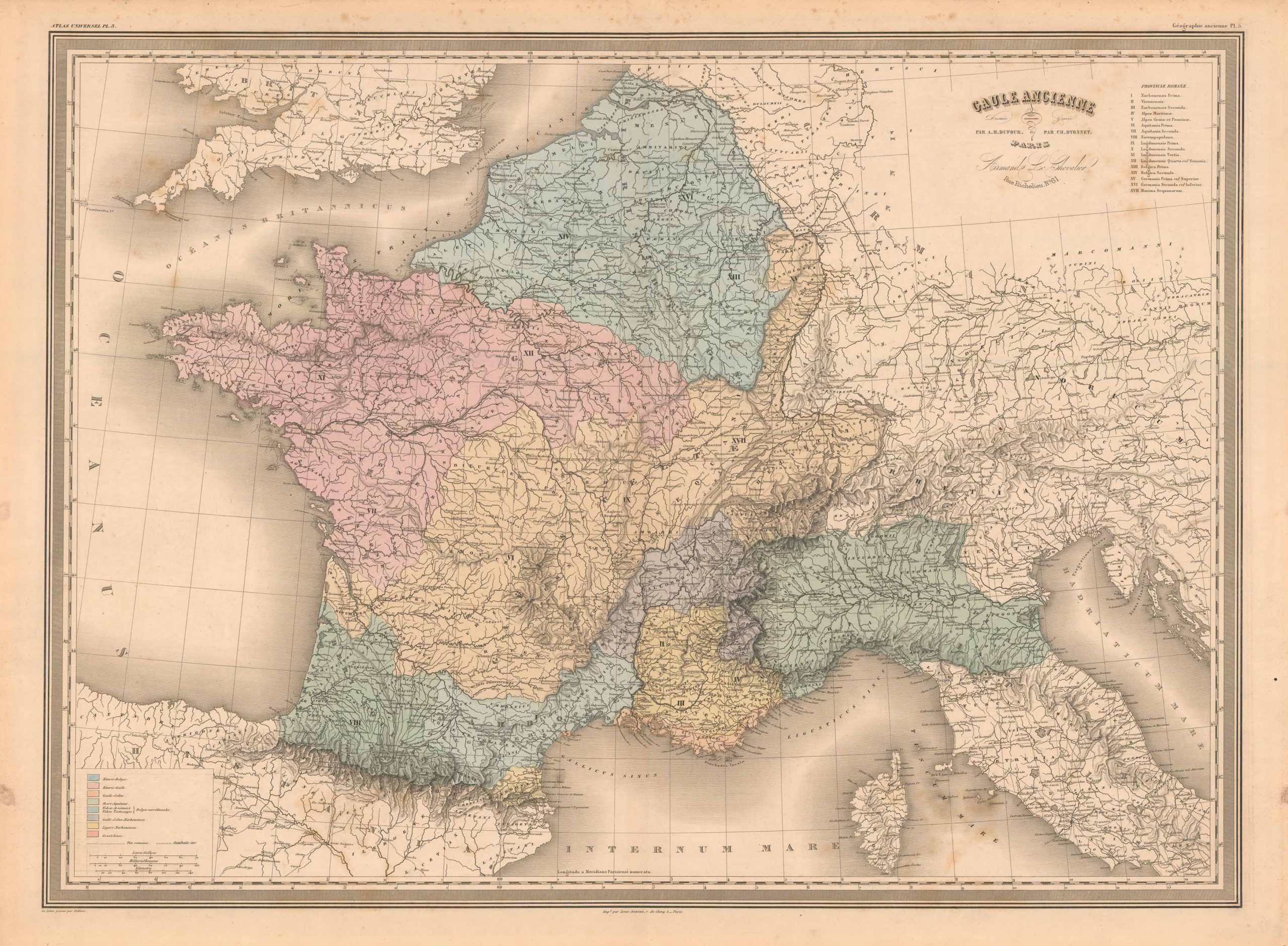 At the height of 19th century cartography, comes the work of H. Dufour. In Dufour’s work, we see a consummate example of French steel-engraving at the time, with its rich ability to depict texture as well as detail, and here, portraying the latest in geographic information. These uncommonly large maps, are the state of the art for the time, and convey a strong sense of the French aesthetic at the time, with a wealth of detail shown in a clean, articulate and ornate fashion. These are unique maps with a large stately presentation, and rich original hand color. These very detailed maps show cities and towns, lakes and rivers, topographical features, as well as numerous other details. This map shows ancient France showing different ethnic areas.