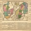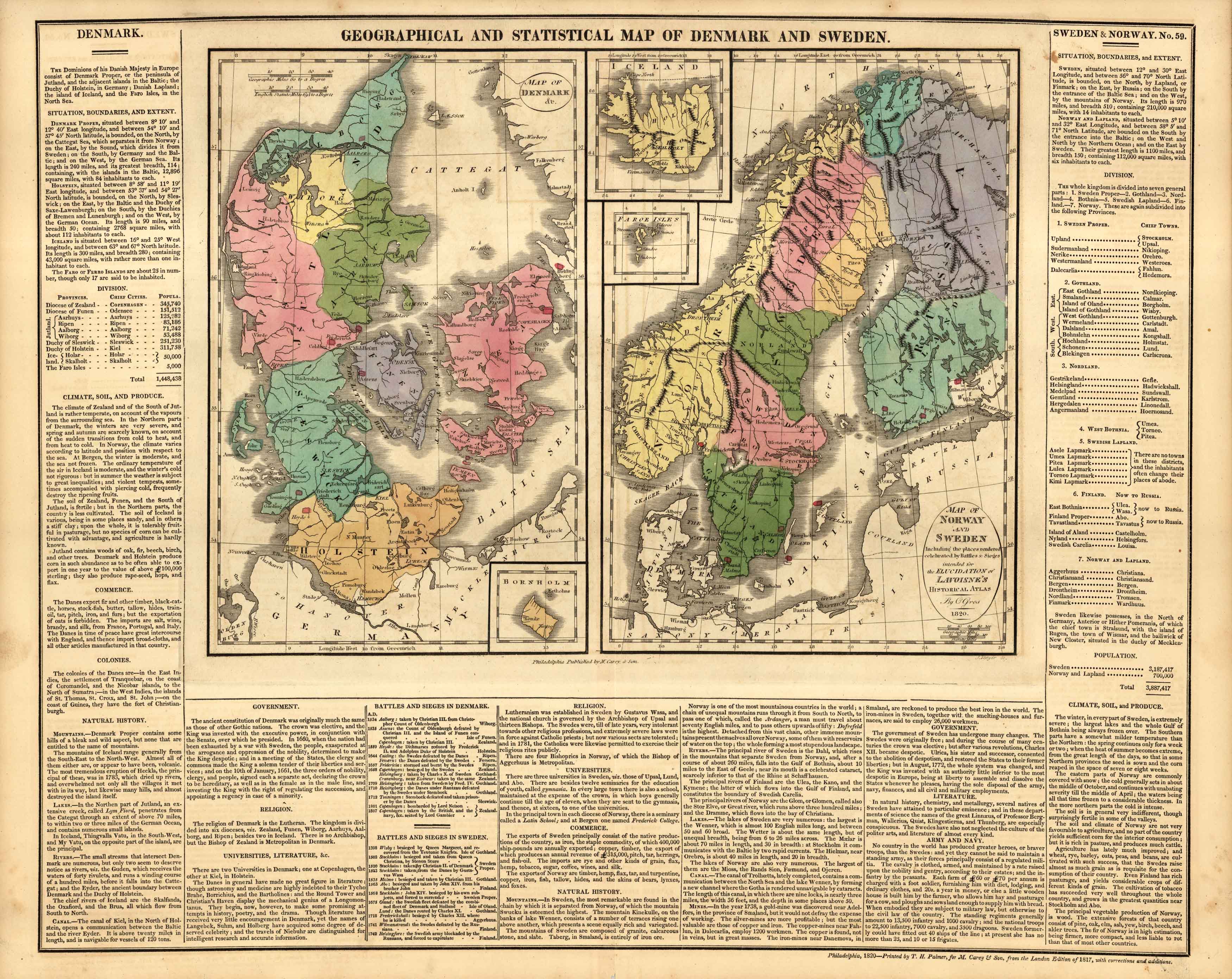 This beautiful map of Denmark and Sweden came from M. Lavoisnes Genealogical Historical Chronological and Geographical Atlas. This brightly colored copper-plate engraving has two maps, of Denmark and Finland (marked Russia), Sweden, and Norway. It also includes insets of Bornholm, Iceland, and the Faro Isles, and important geographical, historical, and political information surrounding the maps. ‘