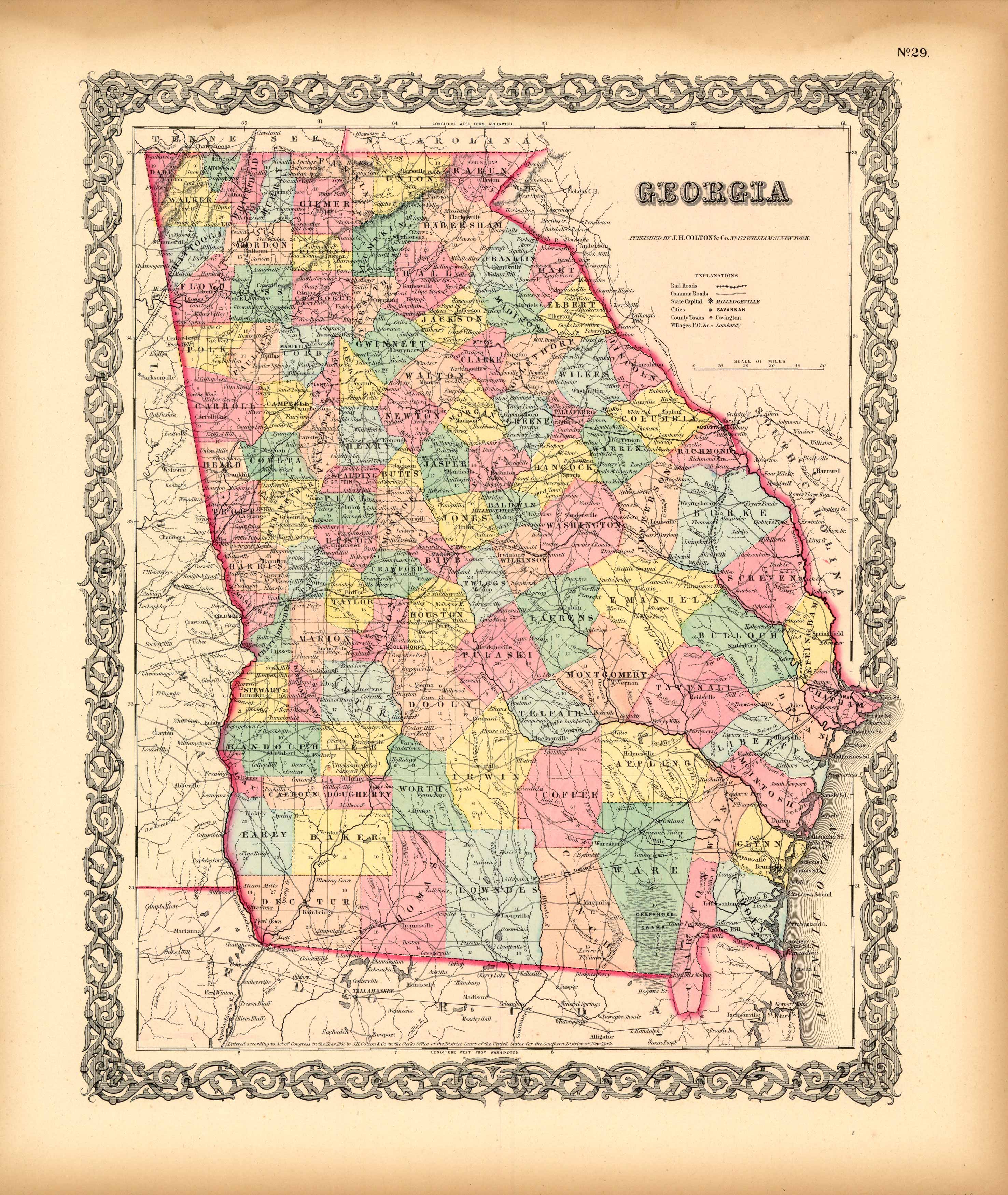 Art Source International is proud to offer this map of Georgia from the 1856 edition of Coltons Atlas of the World. Colton atlases, especially those from the 1850’s, have become increasingly rare. The Colton maps were engraved by steel plates rather than by wax engraving, which was the most common method used at this time. These maps are very detailed in beautiful hand colored pastels, and feature Colton’s signature 3/4 inch border. This map shows cities, towns and villages, transportation routes, common roads, canals, rivers and lakes, and other geographical features. ‘