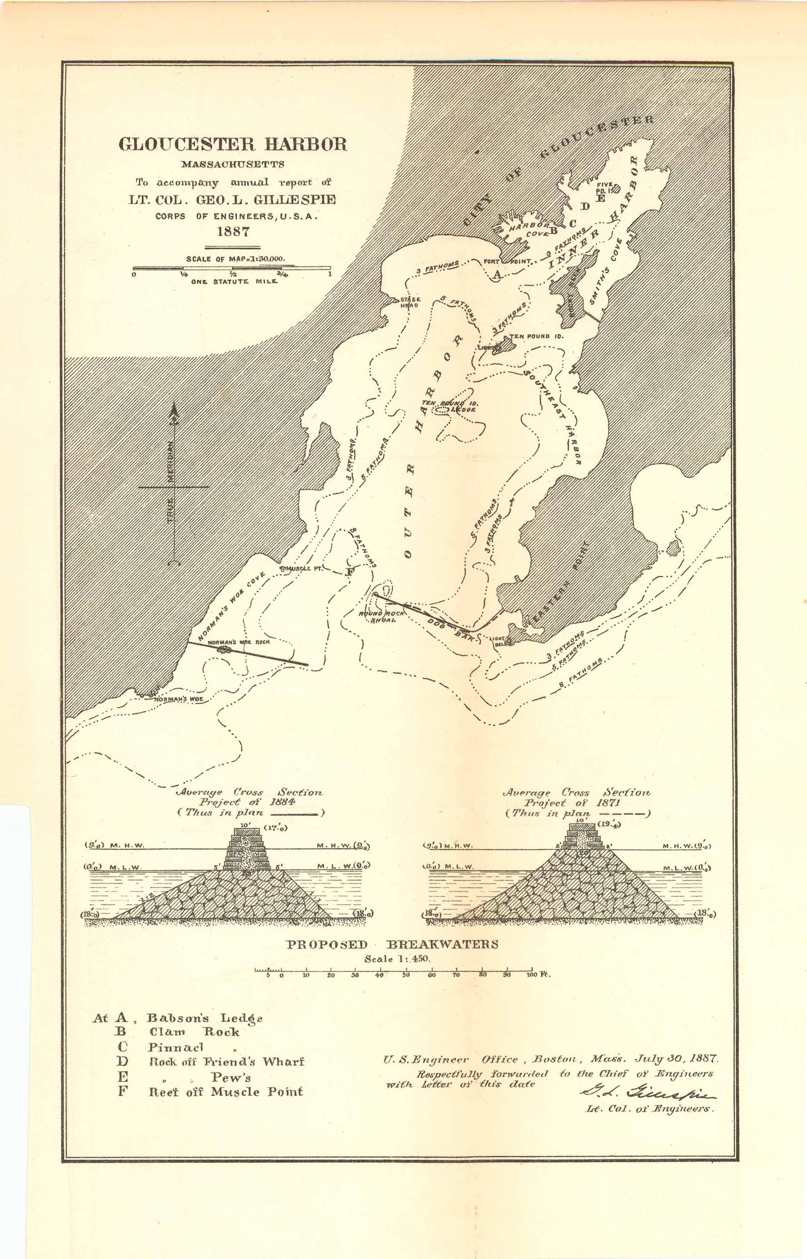 This map of Gloucester Harbor in Massachusetts shows the city of Gloucester, the Harbor Cove, Smiths Cove, fathoms, shoals, a lighthouse, rocks, and more. It shows the average cross sections in the projects of 1871 and 1884, proposed breakwaters, and includes an index of locations by letter at the bottom.