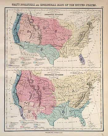 This hand colored map was made for “Grays Atlas of the United States” by O.W. Gray in 1877. The botanical and zoological regions of America are illustrated on these two maps. Regions are distinguished by bright pastel color. Other details include the names of states, and important cities, rivers,and lakes.