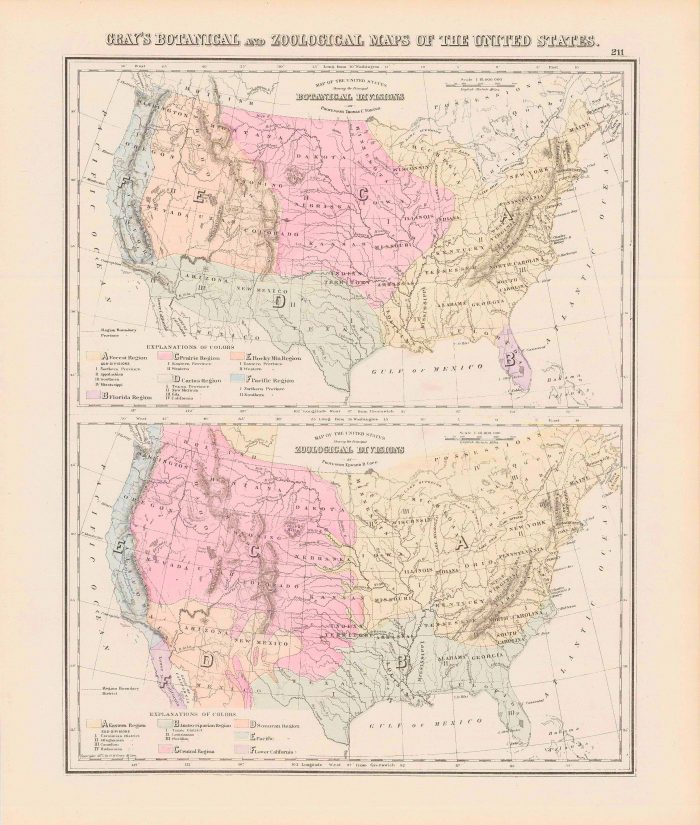 This antique map of Botanical and Zoological Maps of the United States was produced by O.W. Gray as part of his “National Atlas” in 1884. Gray was involved in the production of Atlas’ from ca. 1871 – 1886. We love his maps because of the wonderful hand coloring and attention to detail.