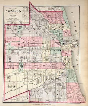 This hand colored map was made by O.W.Gray and son in 1881 for “The National Atlas”. The city of Chicago is illustrated on this map. Sections of the city are differentiated by color. Other details include the names of streets, important buildings, and railroads, and illustrations of railroads, lakes, and rivers. This map has retained its original bright coloring very well for its age.