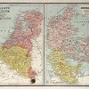This map was made by George F. Cram for “Crams Unrivaled Family Atlas” in 1895. Holland and Belgium are illustrated on the left map and Denmark is shown on the right. Countries are distinguished by color. Other details include the names of countries, important cities, major roads, hills, rivers, mountains, and lakes.