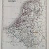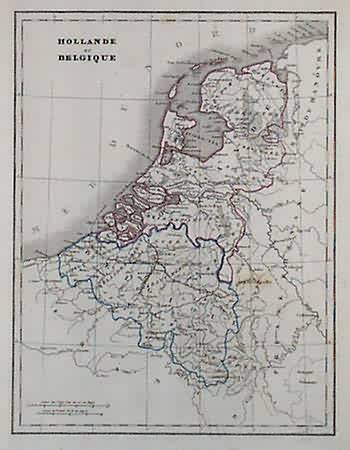 E. V. Monin made the “Atlas Universel de Geographie Ancienne & Moderne en 42 Cartes” circa 1822 in Paris. Bright colors highlight regions on these small, but detailed maps. This hand colored, French map illustrates the Holland and Belgium. The names of regions, important cities, mountain ranges, lakes and rivers are identified. These old maps are in very good condition with unique outline coloring.