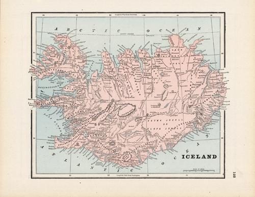 This beautiful map of Iceland was produced by John Iliff via cerographic engraving (a process in which the printing plate is manufactured from an engraving on wax). Using information from the 1890 US census, these maps are very detailed. Cities and towns, rivers, and other geographic features are shown on this map. These maps have become increasingly difficult to find over the years.