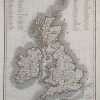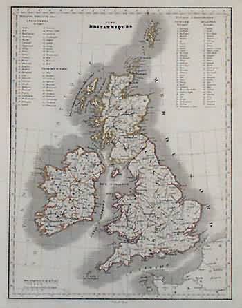 E. V. Monin made the “Atlas Universel de Geographie Ancienne & Moderne en 42 Cartes” circa 1822 in Paris. Bright colors highlight regions on these small, but detailed maps. This hand colored, French map illustrates the British Isles. The names of regions, important cities, mountain ranges, lakes and rivers are identified. These old maps are in very good condition with unique outline coloring.
