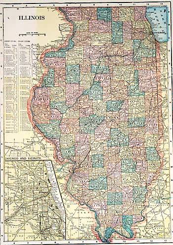 This map was produced for the “Monarch Standard Atlas” , by J.Martin Miller in 1905. Illinois is illustrated on this map with a list of counties and chief cities to the right of the page. An inset shows Chicago and the vicinity at a greater scale than the main map. Counties are distinguished by color. Other details include major roads,illustrations of lakes, rivers,national parks, and mountains. The atlas proclaimes that it offers “complete, original and authentic maps of the present developement of all the countries, empires and states of the world comprising a graphic description of the people: their civilization, their religion, their government, their cities, their important exports, their wealth, their railways, their canals, their cables, their telegraphs, ect., including a description of their climate, the productions, the rivers, the valleys, the lakes, the mountains, the minerals, the glaciers, and every other subject of interest to the american people.”