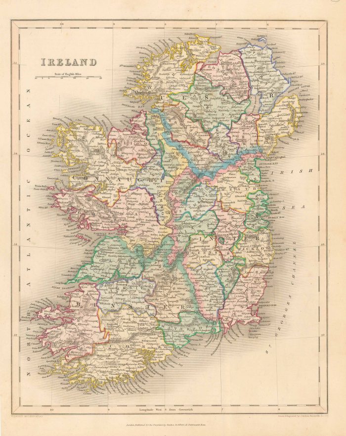 We are proud to offer this very rare map of Ireland by James Gilbert. This map was issued in 1840 as part of Gilbert’s Modern Atlas of the Earth. In our over 40 years in the antique map business, it is difficult to remember any finer maps than these. The coloring is exquisite, the engraving is exceptional, and the paper quality is extraordinary.