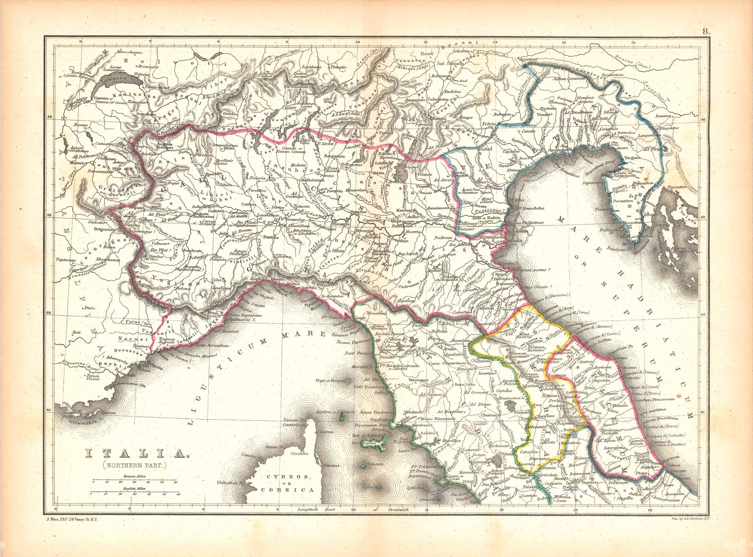 William Hughes included this skillfully constructed map of Northern Italy in his Atlas of Classical Geography from 1867. This atlas features smaller sized format maps with bright outline watercolor. Among other details, these maps show topography, rivers, cities, islands, and major landmarks. Each one would make a superb gift and because of their small size, are easy to frame.