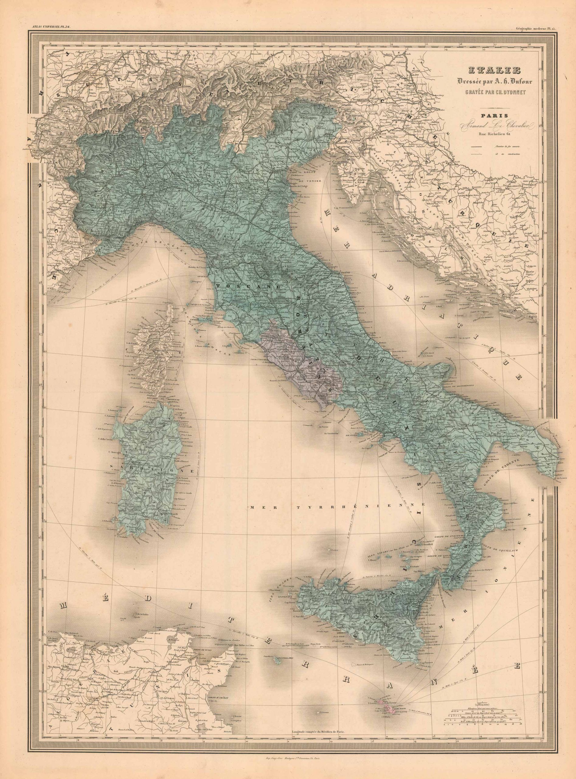 At the height of 19th century cartography, comes the work of H. Dufour. In Dufour’s work, we see a consummate example of French steel-engraving at the time, with its rich ability to depict texture as well as detail, and here, portraying the latest in geographic information. These uncommonly large maps, are the state of the art for the time, and convey a strong sense of the French aesthetic at the time, with a wealth of detail shown in a clean, articulate and ornate fashion. These are unique maps with a large stately presentation, and rich original hand color. These very detailed maps show cities and towns, lakes and rivers, topographical features, as well as numerous other details.