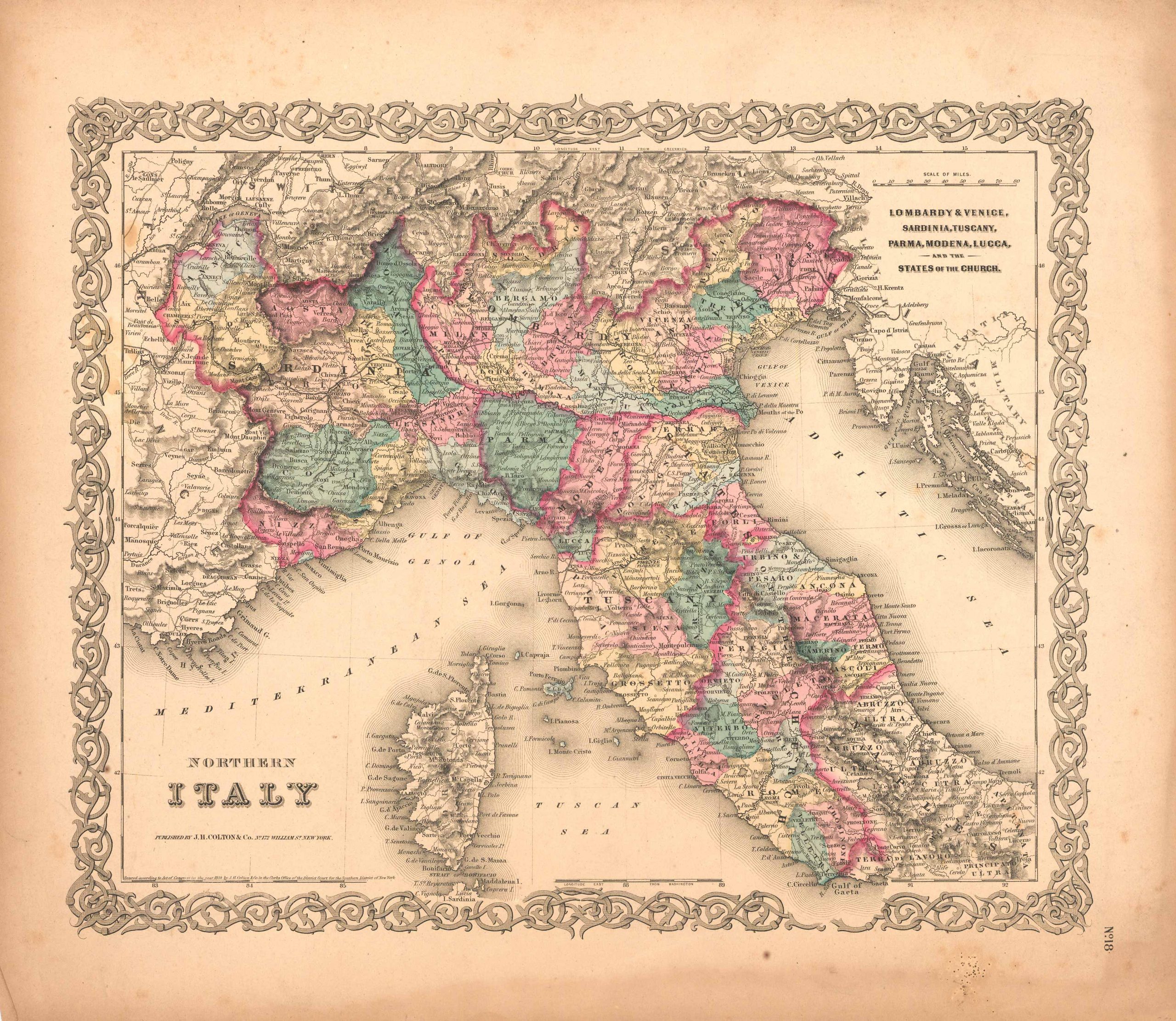 Art Source International is proud to offer this map of Northern Italy from the 1856 edition of Coltons Atlas of the World. Colton atlases, especially those from the 1850’s, have become increasingly rare. The Colton maps were engraved by steel plates rather than by wax engraving, which was the most common method used at this time. These maps are very detailed in beautiful hand colored pastels, and feature Colton’s signature 3/4 inch border. This map shows countries and/or regions, cities, towns and villages, transportation routes, common roads, canals, rivers and lakes, and other geographical features.