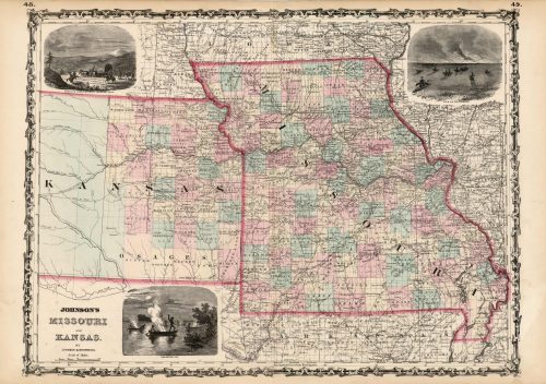 Johnson and Browning produced this steel plate, hand colored map for “Johnsons New Illustrated Family Atlas” in 1862. Missouri and Kansas are illustrated on this detailed, double page map. Counties are distinguished by bright pastel colors. Other details include railroads, lakes, rivers, mountains, major roads, and the names of states, counties and important cities.
