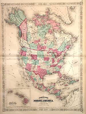 This map is from Johnsons New Illustrated Family Atlas of the World printed in 1868 by A.J. Johnson. Johnson maps are characterized by hand coloring in red and green and distinctive borders, including iron scrollwork and a Celtic design. This is a very beautiful map of North America,in great condition. This map of North America contains an inset of the Hawaiian Islands. At this time North and South Dakota were a unified state, Oklahoma was Indian Territory.